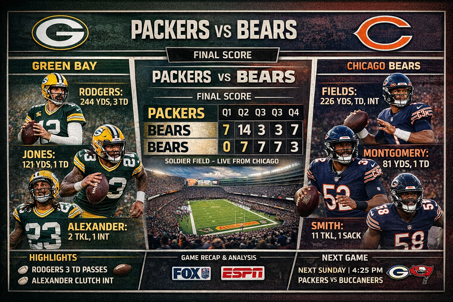 In this article, we break down the most recent Packers-Bears showdown. We look at every important player on both sides. You will see passing yards, rushing attempts, catches, tackles, sacks, and more. No fluff. Just clean, easy-to-read numbers.
