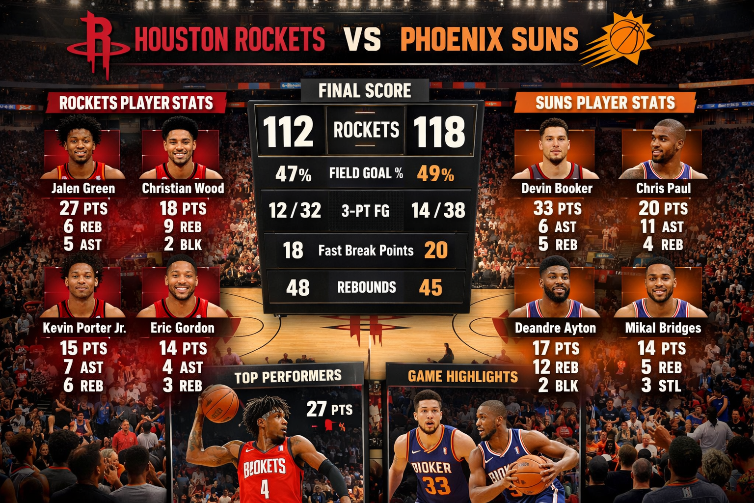 The game started with a bang. Both teams wanted to prove something. For the Rockets, young guard Jalen Green looked unstoppable. He scored 9 quick points in the first six minutes. His speed left defenders in the dust. On the other side, Kevin Durant showed why he is a legend. He hit two smooth three-pointers right away. The Houston Rockets vs Phoenix Suns match player stats from the first quarter alone were incredible.